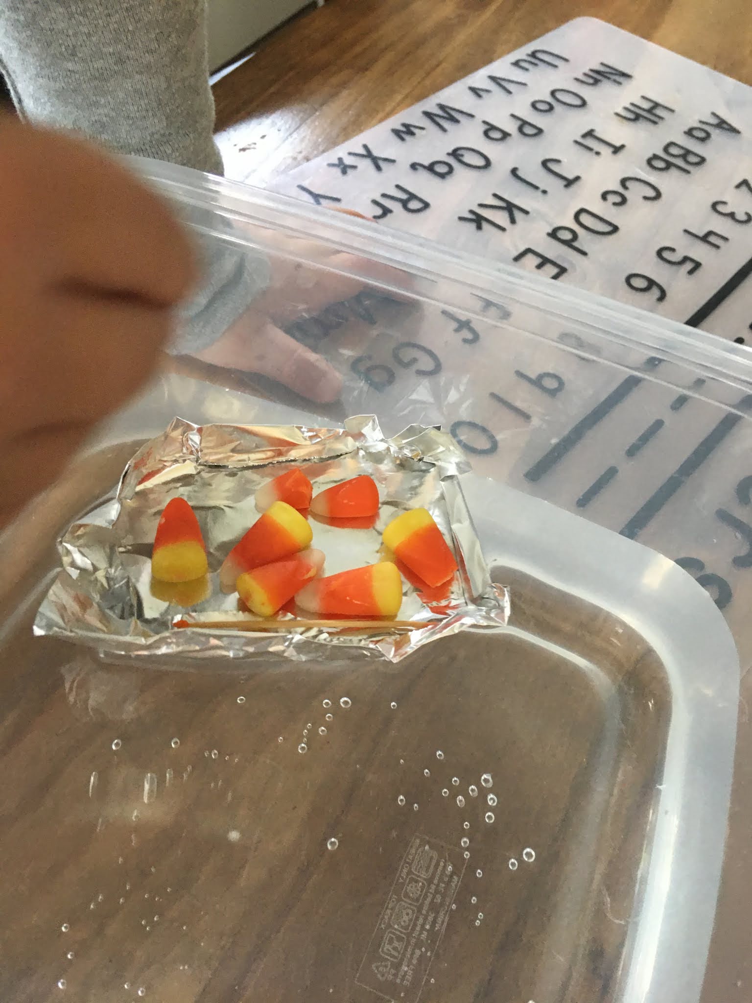 Using aluminum foil squares, fold up the edges and float them in a bucket of water. Add candy corns and watch them float around. See how many candies it will take to sink the boat!